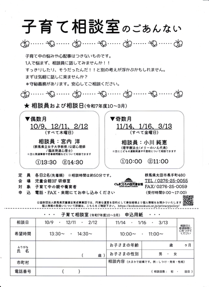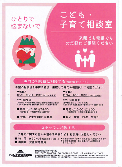 太田市にある「ぐんまこどもの国児童館」の委託を受け、隔月にて代表の小川による子育て相談を行っております。